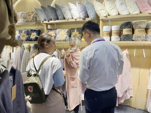 开展第一天,家纺摊位琳琅满目的展品便吸引了众多客户驻足。一走进去,立刻让人萌生出逛品牌服装店的感觉,不少客户更是直接在摊位套上了睡袍,一整个体验感十足!在对产品有了最直接地了解后,纷纷表示出浓厚的合作意向。