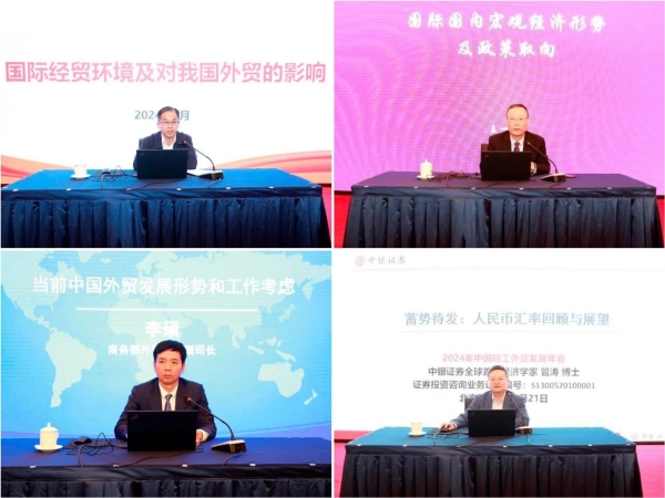 中国国际经济交流中心副理事长王一鸣、商务部驻天津特派员办事处特派员刘长于、商务部外贸司副司长李硕等相关部门领导、专家分别就《国际国内宏观经济形势及政策取向》《当前中国外贸发展形势和工作考虑》《国际经贸环境及对我国外贸的影响》《中央政府采购政策宣讲》《蓄势待发:人民币汇率回顾与展望》等主题作专题报告。