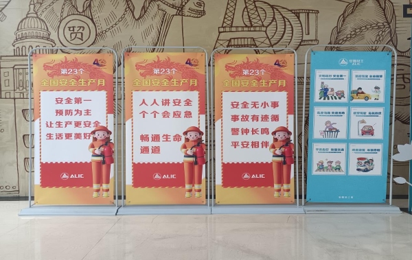 (在人流密集的大厅通道,陈列安全主题宣传展板)
