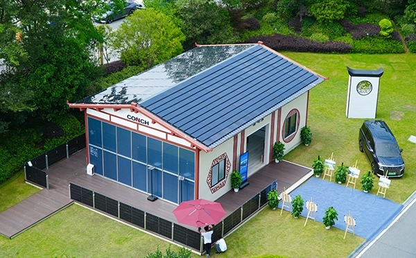 “海螺屋”采用海螺节能环保低碳新材料搭建而成,室内门窗、地板、家具全部采用海螺新材全屋定制生态家居,两侧外墙及屋顶铺设宣城海螺建筑光伏幕墙与光伏瓦,与建筑完美融为一体。“海螺屋”设计融合了中国与东南亚建筑元素,以及海螺生态环保、建筑节能的理念,整体呈现新中式风格,集中展现了海螺集团RCEP区域经贸合作新成就,展示了海螺新能源、新材料和数智发展新成果、新产品,诠释了海螺为人类创造未来生活空间的不懈追求。