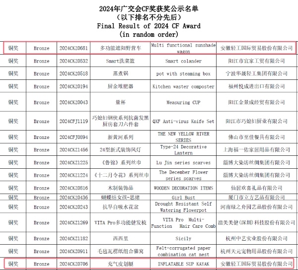 近日,备受行业内瞩目的2024年广交会设计创新奖(以下简称CF奖)评选结果正式揭晓,taptap点点体育自主研发的“充气皮划艇”与“多功能遮阳野营车”两款创新产品,在众多作品中脱颖而出,双双斩获铜奖!这已是taptap点点体育第二次获得CF奖项,也是本次安徽省唯一一家获此奖项的省属外贸企业(安徽仅有taptap点点体育及科大讯飞两家公司上榜)。
