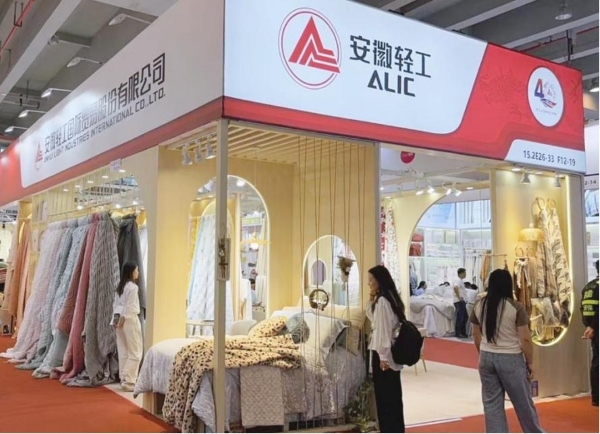 走进家纺展位,仿佛步入了一个梦幻般的世界。本次展位设计大胆摒弃传统框型结构,创新采用圆弧元素,辅以暖色灯带与自然麻绳装饰。令人耳目一新的装修风格与丰富多样的展品相映成趣,彰显非凡品质。面向主通道侧摆放的展示床更是成为了视觉的焦点,搭配上精致的软装,打造出一方精致理想的家居空间。展架上陈列着各式毯子、被子、抱枕等产品,花型繁多,材质多样,引得一众客户驻足。他们或轻抚面料,或细查针脚,与同伴交流意见,并与参展代表深入洽谈,现场气氛热烈,成交意向浓厚。