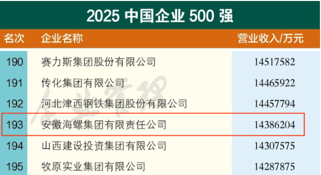9月15日,中国企业联合会、中国企业家协会发布“2025中国企业500强”。这份榜单以2024年企业营业收入为入围标准,入围门槛较上年提高5.79亿元,达到479.6亿元。其中,海螺集团连续21年入围,以14386204万元营业收入排名第193位。