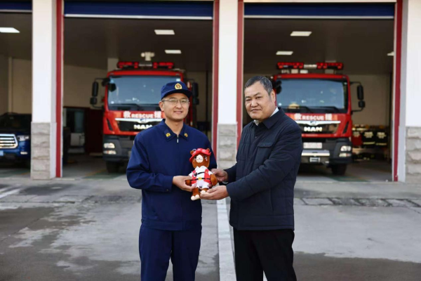 参观学习最后环节,公司安委会副主任薛彦简要介绍了公司消防安全管理的主要措施,向消防救援员赠送了公司安全生产“筑安”品牌形象吉祥物“安宝”,感谢天乐消防救援站多年来对公司消防安全工作的指导。